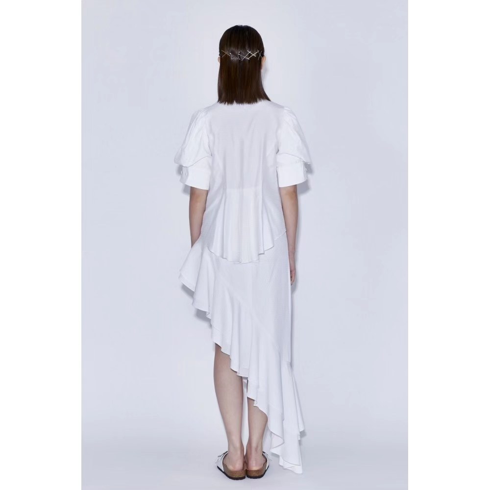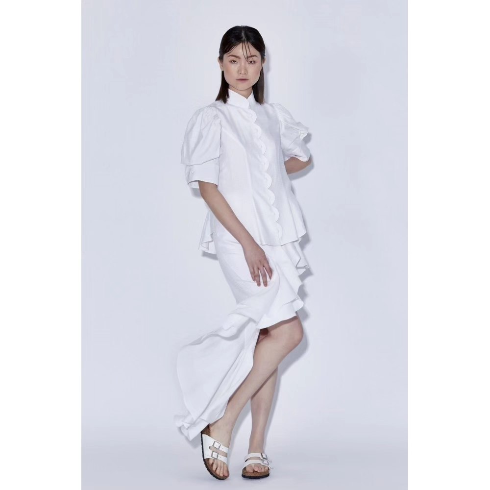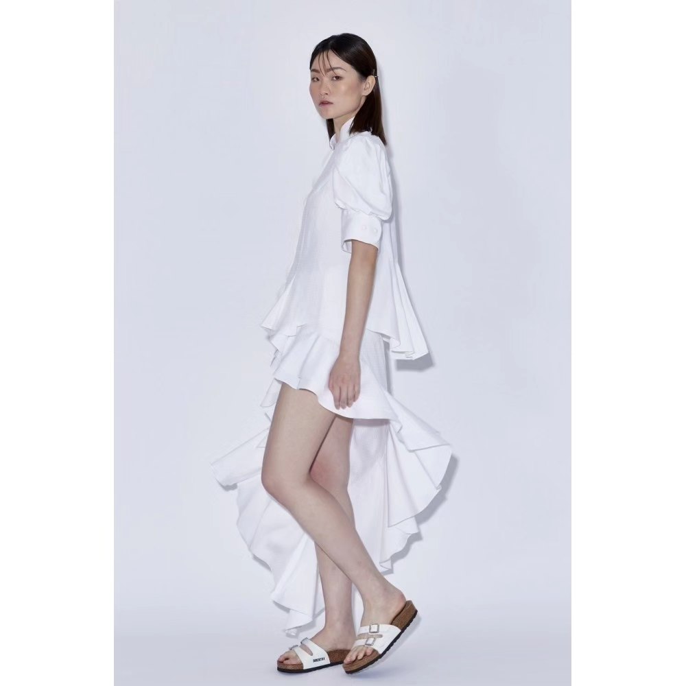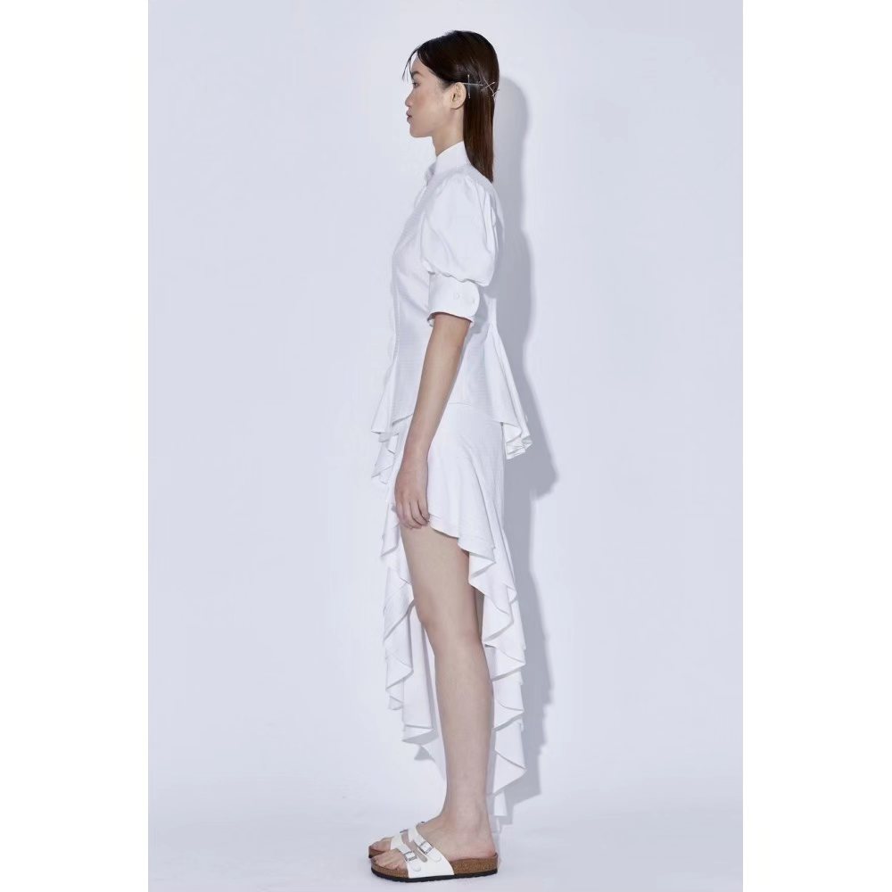 Waterfall skirt: Asymmetric cascading frilly skirt.