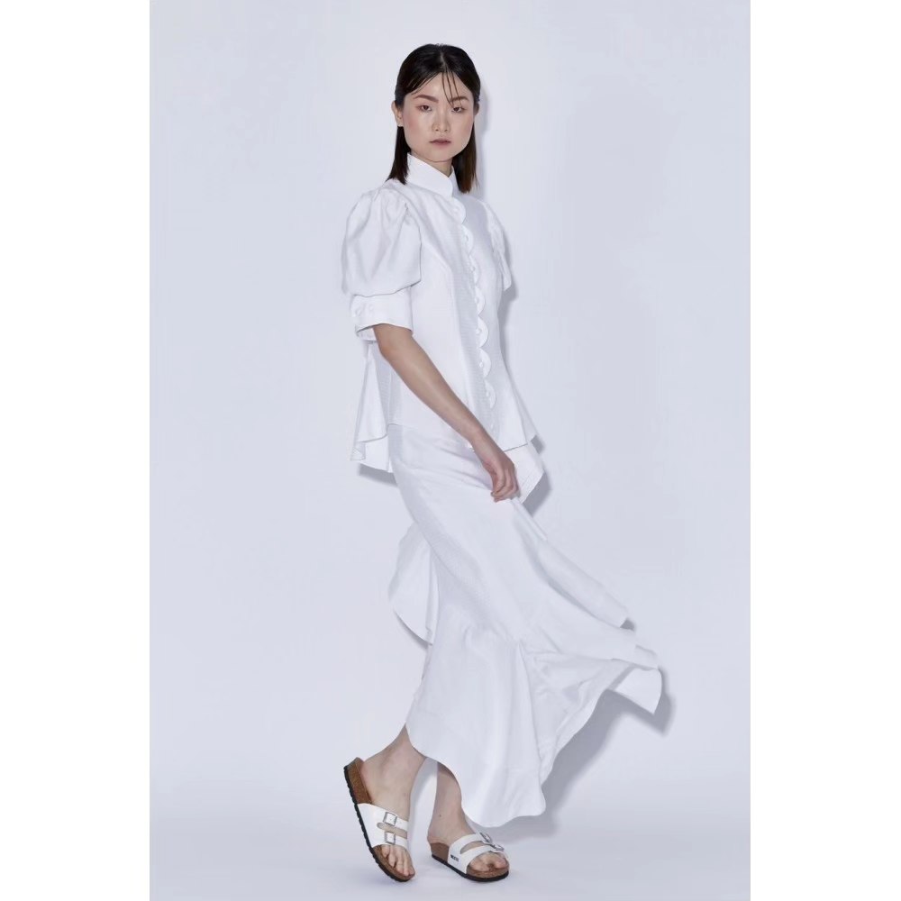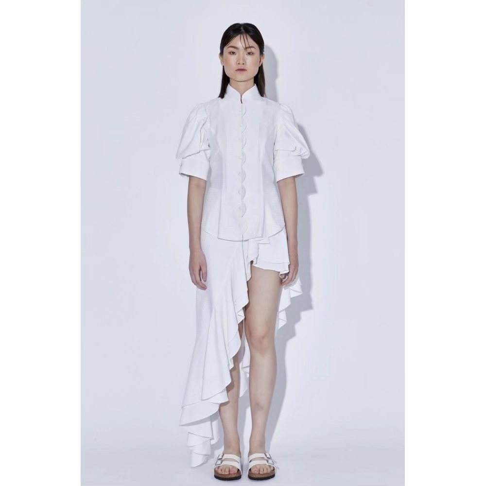 Mandarina top: Puff sleeves top with scallop front topped with covered buttons.
